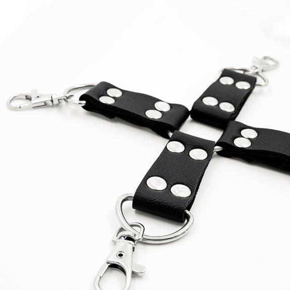 We are going to describe how to use the hogtie, handcuffs, and ankle cuffs together in one of the most common and popular bondage positions. First, you will begin by applying the handcuffs. One at a time, open each handcuff and wrap it around each wrist. The adjustable fastening strap makes it easy to choose the perfect tightness around each wrist. Repeat this same process with the set of ankle cuffs and each ankle. You can remove the middle chain from both the handcuffs and the ankle cuffs. To get into the bondage position the person wearing the handcuffs and ankle cuffs should now kneel and place their wrists together at the small of their back. This should make it so that their hands and ankles are close to each other near the small of their back. Finally, you will take the hogtie, and using the clips at the top of each point, you will fasten one point to each wrist and each ankle. When you are finished each wrist and ankle should be attached to the hogtie near the small of the back.