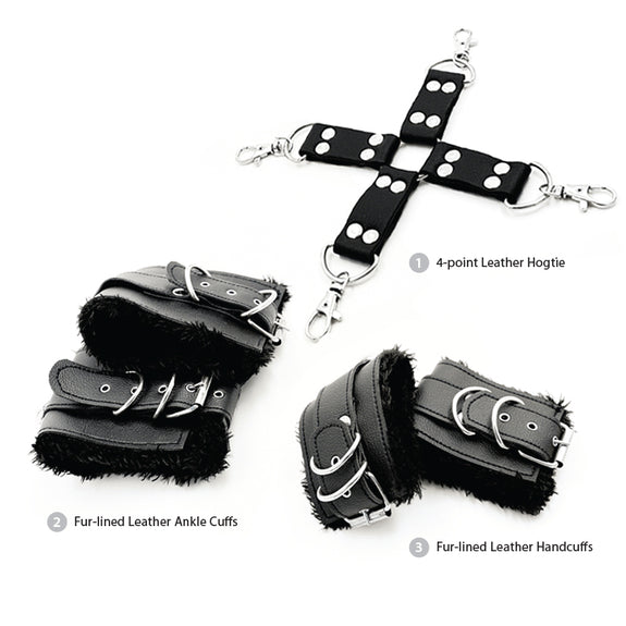 Bondage play is all about power exchange and trust. You need to be able to trust that your partner has your pleasure in mind just as much, if not more than their own. This hogtie set has everything you need to try out basic bondage positions and explore what bondage has to offer. This set includes a set of fur-lined leather handcuffs, a set of fur-lined leather ankle cuffs, and a four-point hogtie. These four toys allow for a variety of popular bondage positions. The quick-release chain on both the handcuffs and ankle cuffs makes for an easy release so they are perfect for beginners, trying bondage for the first time. Order yours online today and have it delivered using our 100% discreet delivery service almost anywhere in India.